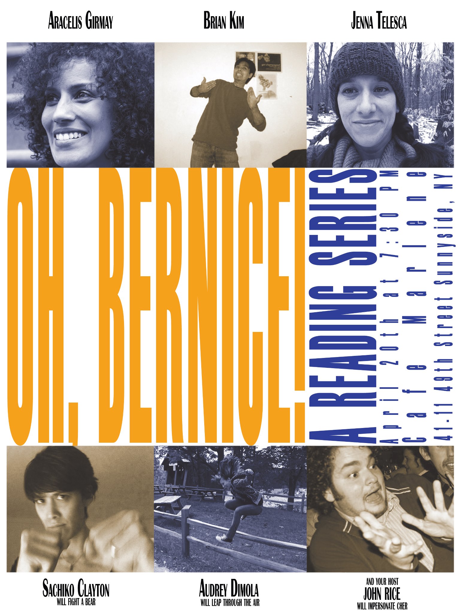 Featuring: Brian Kim, Jenna Telesca, Sachiko Clayton, Audrey Dimola, John Rice as host, and one of the most hilarious event posters I’ve ever seen. Oh, Bernice’s website is here, and video from my performance that night is here.
