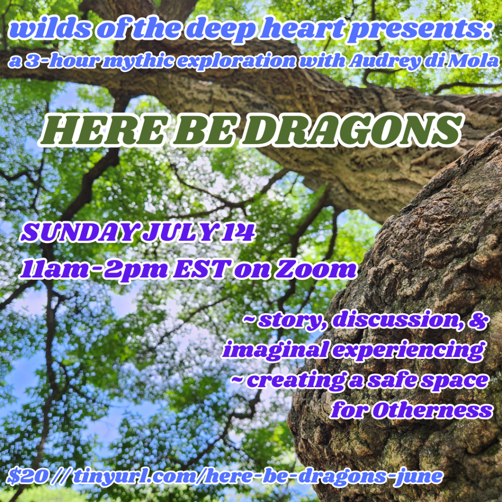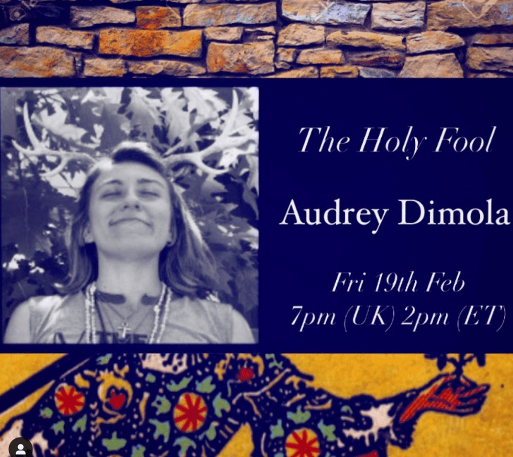 Multidisciplinary artist, space-holder, and oral tradition storyteller Audrey di Mola is deeply informed by her first stretch of time in the underworld; a.k.a. the years she spent in what is commonly referred to as ‘mental health crisis’ and suicidality. Audrey shares in a characteristically honest and experiential presentation how her bipolar II diagnosis became mythically re-translated as a walk with a black wolf and a white wolf– and how the rest of her incredible, life-saving journeys in Legend grew out from there. Not intended for only those who have lived experience with mental health crisis or have received diagnoses– curiosity and ‘leaning in’ is more than welcome. These learnings from the profound generativity of Audrey’s descents and re-emergences can be applied, in general, to engaging life in a more intentional, spacious, integrated, deep listening, and imaginally-interwoven way.