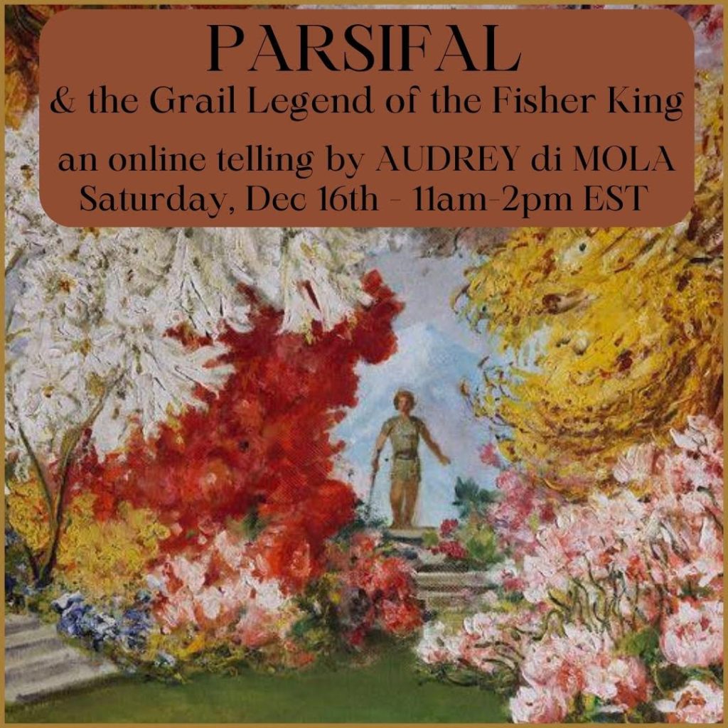i cancelled the last monthly online story gathering in light of one of the Other most important things i have ever done in my life, one of the greatest and most profound Honors– walking an old friend through the threshold of their physical death. i am Changed, my heart has been broken, widened– my scope of the Most Precious and Most Terrible– deepened. i have been sensing this story, not only walking along the edges of my periphery, but/and i have felt a Longing inside me to be lost inside it, as only one of the Big, Old, Winding tales can immersively cloak you. i have needed that place, that Returning, after All Of This– and this morning while on the way to a yoga class i opened a little free library box on the street and found, immediately, a book called: ‘healing the wounded king: soul work and the quest for the grail.’