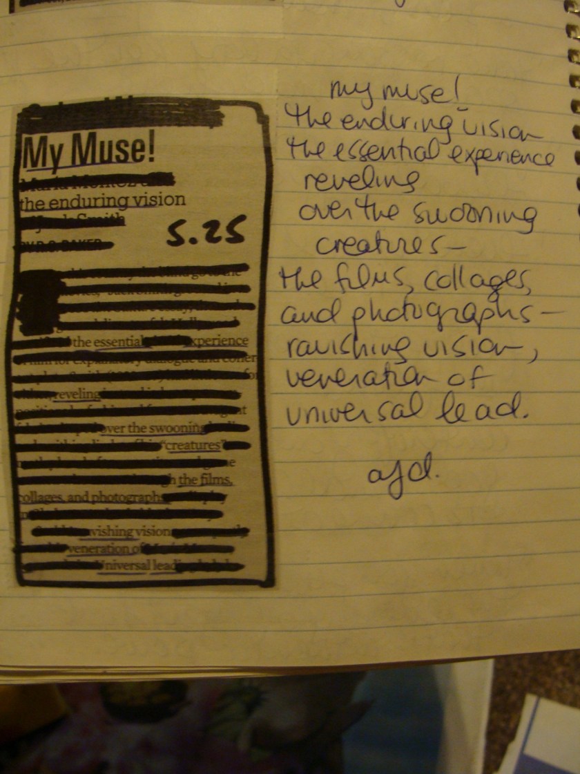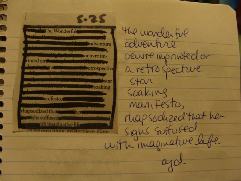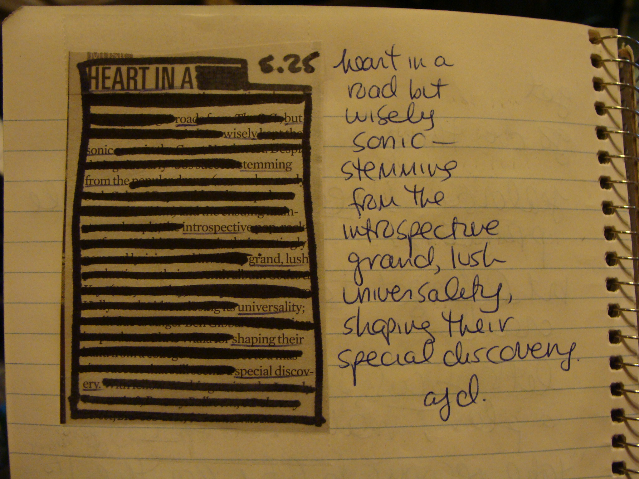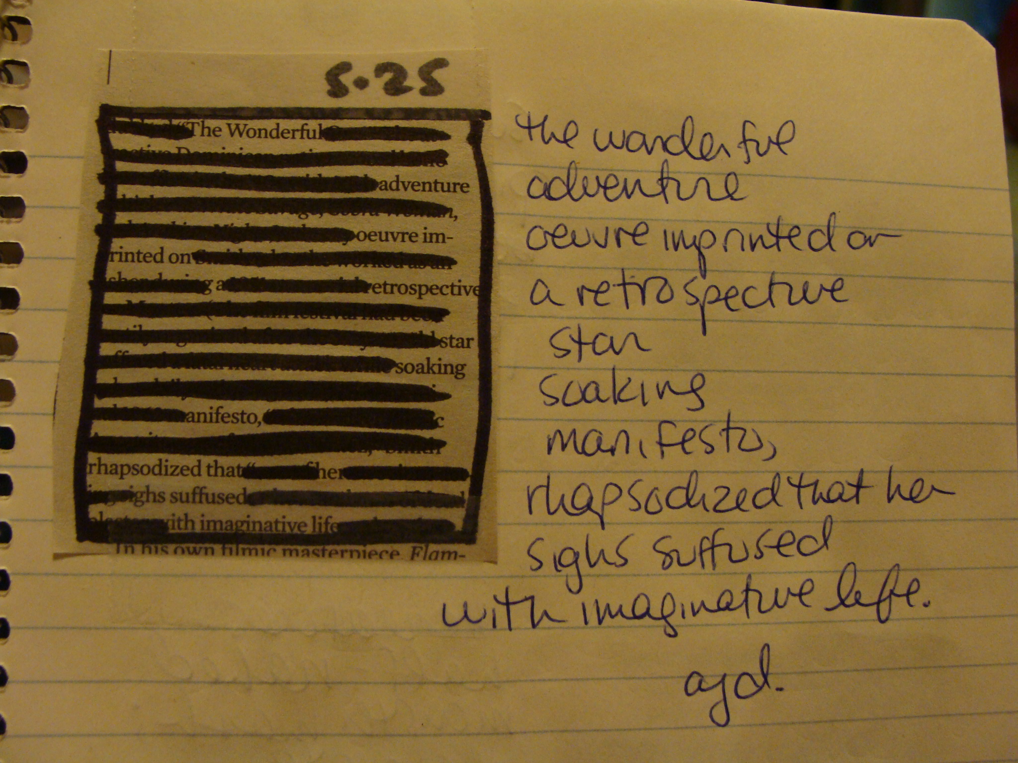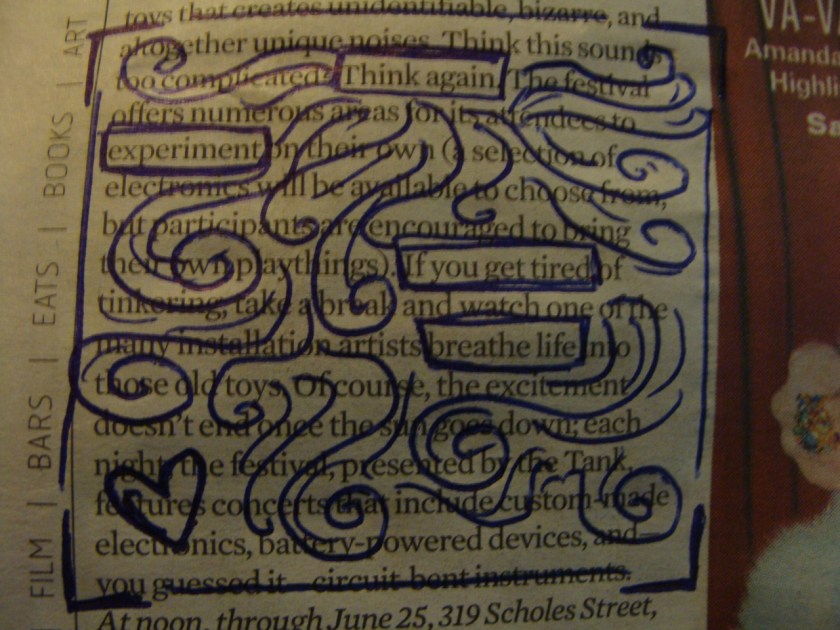 Playing around with some blackout poetry – what happens when you make your own poetry by taking a sharpie to a newspaper! Village Voice works quite well. Thanks for the inspiration, Newspaper Blackout and Tyler Knott.