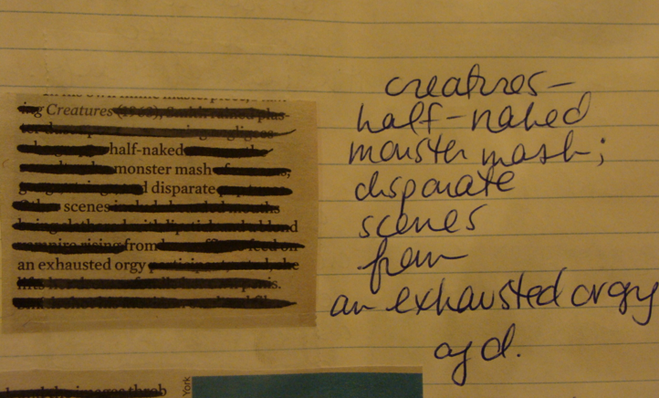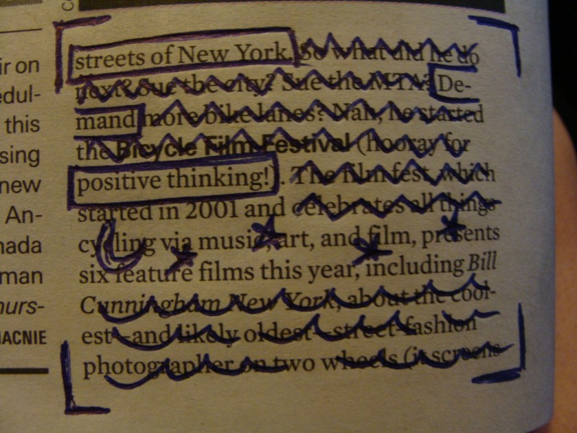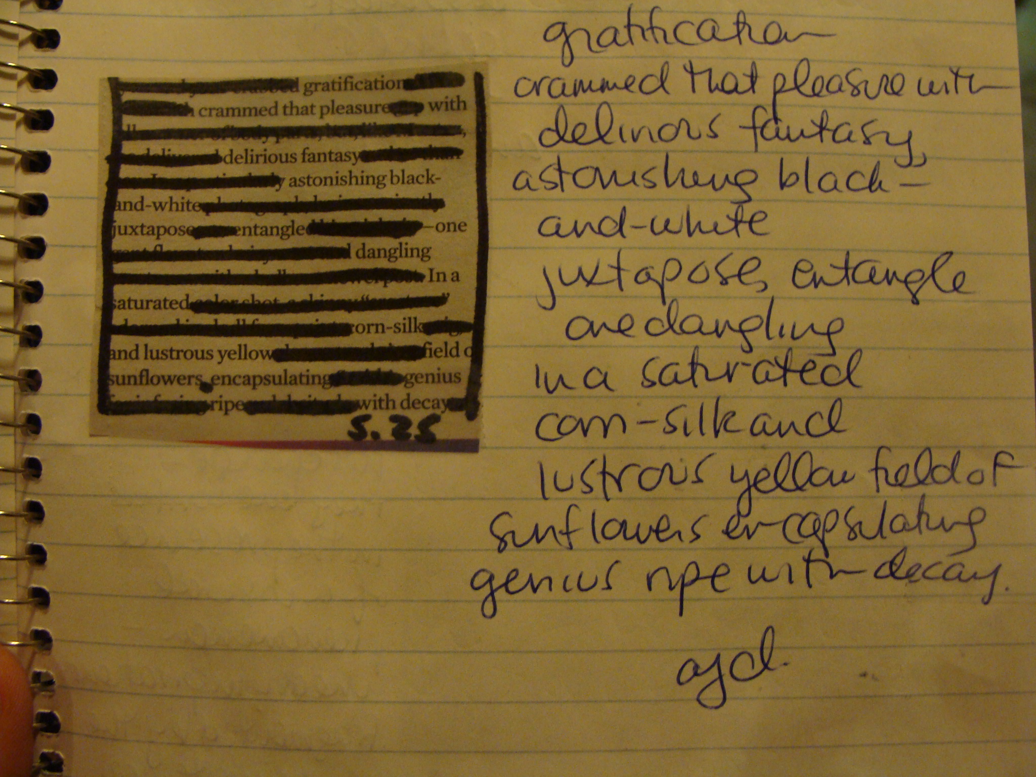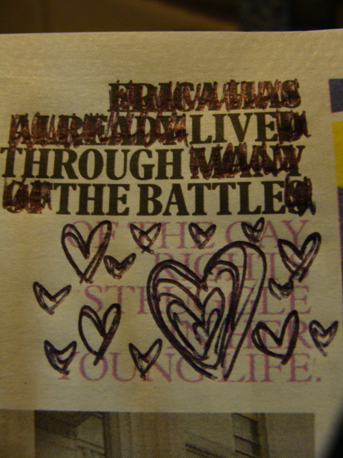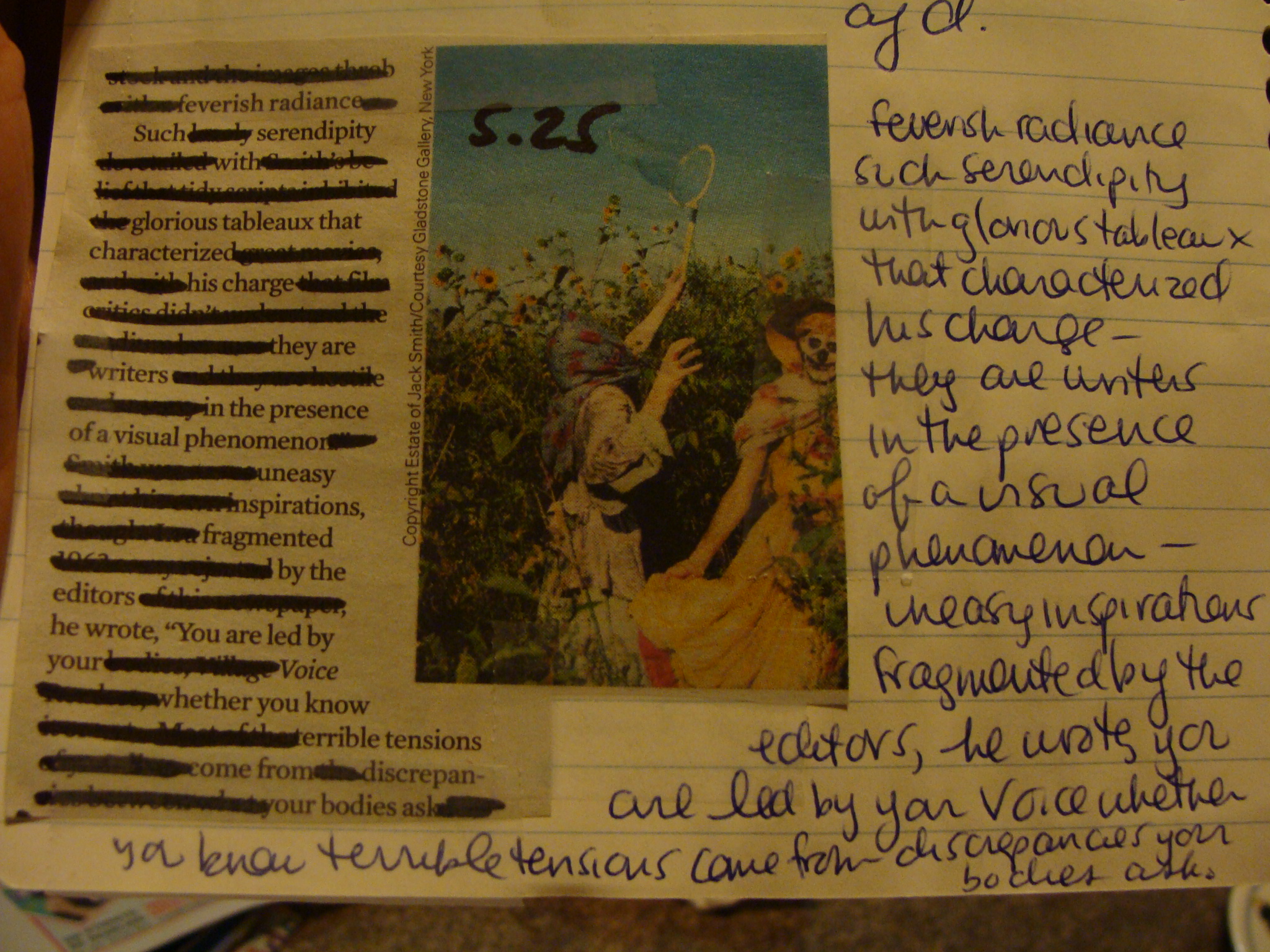 Playing around with some blackout poetry – what happens when you make your own poetry by taking a sharpie to a newspaper! Village Voice works quite well. Thanks for the inspiration, Newspaper Blackout and Tyler Knott.